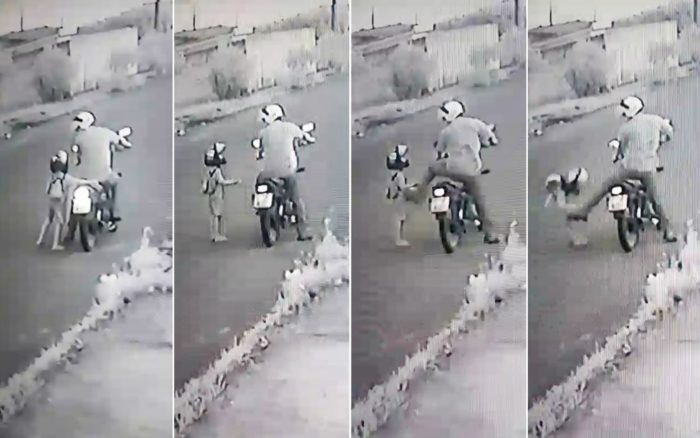 Nas imagens, o padrasto e a criança param de moto na Rua Yoshinobu Kobata. O menino desce da garupa, usando capacete e uma mochila, parece conversar com o homem e é agredido com um chute no peito pelo padrasto, que continua no veículo.