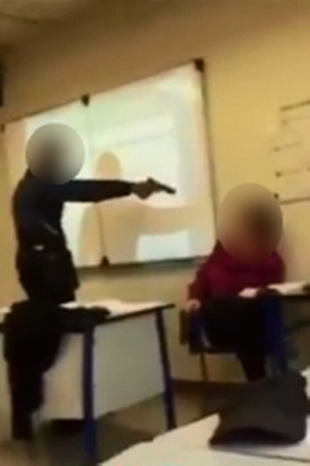 Um aluno de 16 anos foi filmado apontando um simulacro de arma de fogo para uma professora numa escola na França, enquanto ordenava que ela lhe desse presença no diário de classe, na última quinta-feira.