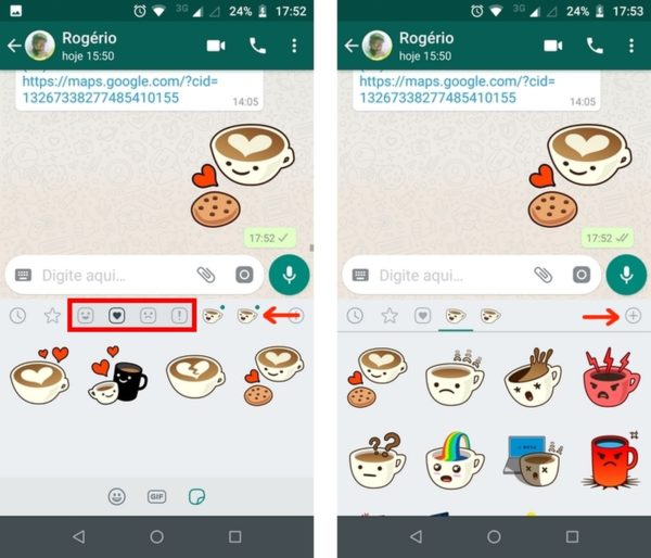 Passo 2. Por padrão, a nova função traz apenas o pacote “Cuppy”, com xícaras. O WhatsApp incluiu quatro atalhos para separar diferentes categorias de figurinha e agrupar as com rosto feliz, com corações, tristes e também de espanto. Toque no ícone do sticker para ver todos os desenhos do pacote. Basta dar um toque simples sobre o adesivo para enviá-lo pelo chat. Mais figuras podem ser baixadas ao pressionar o botão “+”;
