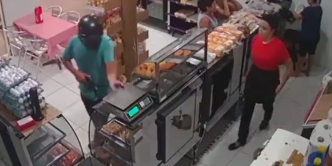 Quatro mulheres estavam no local, duas clientes e duas funcionárias, quando um homem invade a panificadora usando um capacete e apontando uma arma.Uma das mulheres, que é idosa, chega a se assustar muito quando percebe se tratar de um assalto.