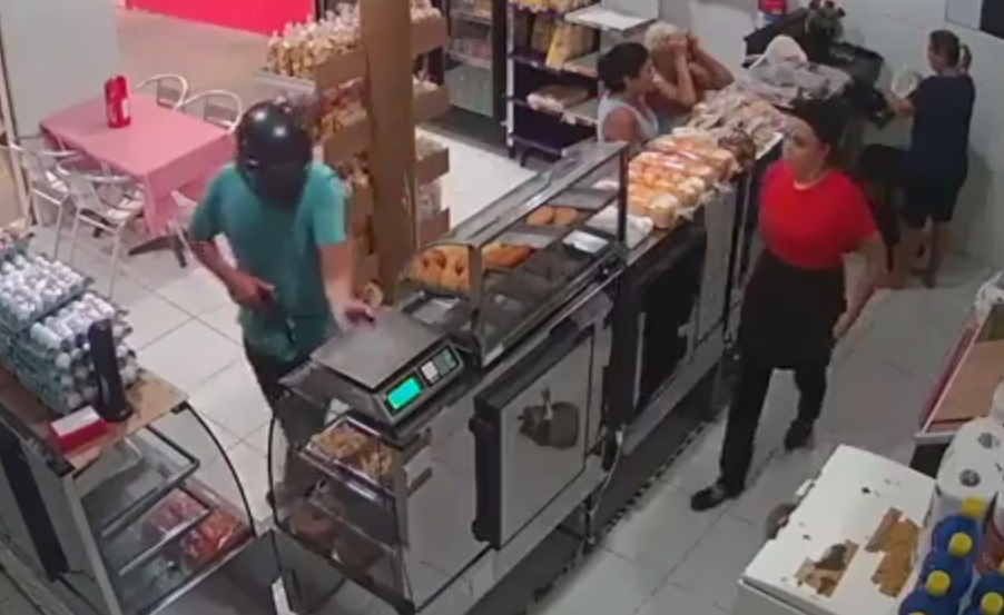 Quatro mulheres estavam no local, duas clientes e duas funcionárias, quando um homem invade a panificadora usando um capacete e apontando uma arma.Uma das mulheres, que é idosa, chega a se assustar muito quando percebe se tratar de um assalto.