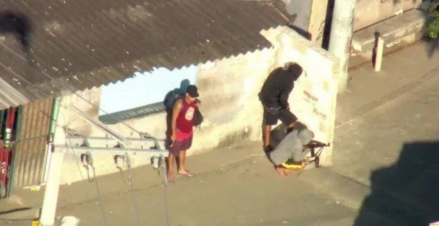 Um deles usa um buraco na estrutura para apoiar sua pistola e disparar. Outro, com um fuzil, está agachado e atira a esmo em direção a um local onde está posicionado um caveirão da Polícia Militar. Um terceiro criminoso está de pé, um pouco mais atrás.