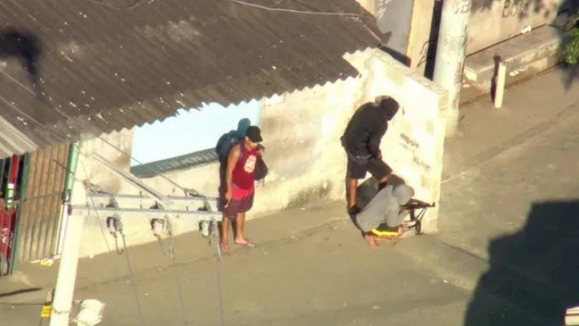 Um deles usa um buraco na estrutura para apoiar sua pistola e disparar. Outro, com um fuzil, está agachado e atira a esmo em direção a um local onde está posicionado um caveirão da Polícia Militar. Um terceiro criminoso está de pé, um pouco mais atrás.