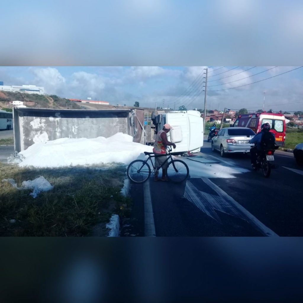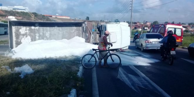 Um caminhão caçamba carregado de caulim tombou no início da manhã desta sexta-feira (7), na BR-230, na divisa entra Bayeux e Santa Rita, na Região Metropolitana de João Pessoa.