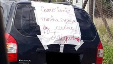 Foto de veículo com cartaz: “Carro lento, minha esposa fez cesária”, viraliza nas redes sociais