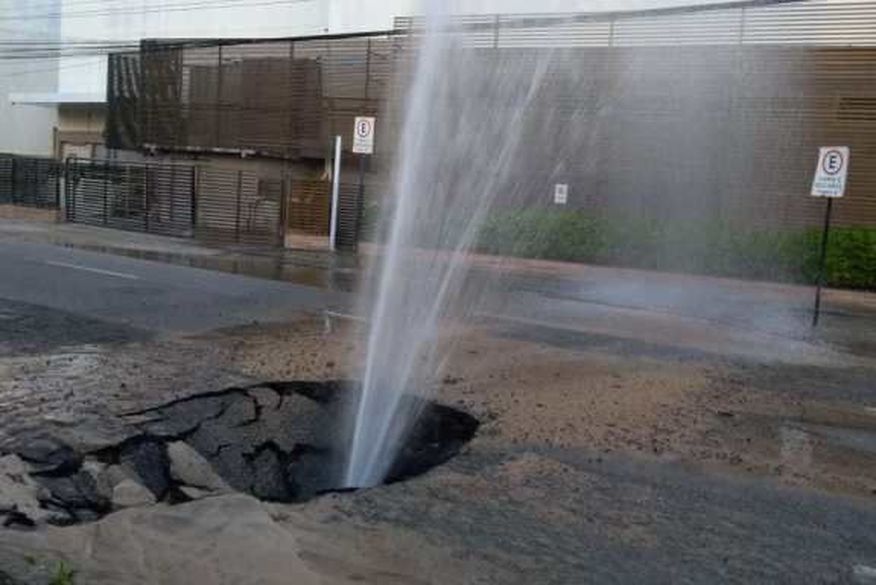 A água estaria jorrando devido ao vazamento de uma tubulação, que teria começado por volta das 3h30. Devido à força da água, o asfalto na rua por trás do Tambiá Shopping acabou cedendo.