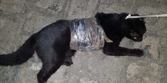 Com o gato foi encontrado 120 gramas de substância semelhante à maconha e cinco cabos de carregador de celular, que estavam amarrados por fita ao redor do seu corpo.