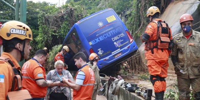 Temporal causa danos na cidade do Rio de Janeiro. Na avenida Niemeyer, que liga os bairros do Leblon e São Conrado, na zona sul, deslizamento atingiu um ônibus, que acabou tombando sobre a ciclovia na encosta da pista.