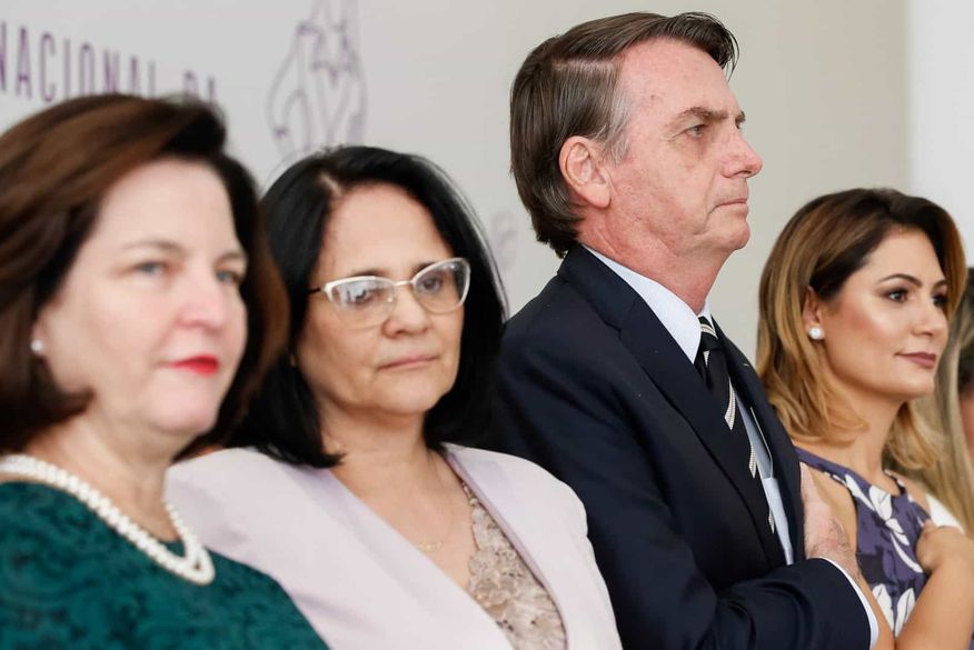 Em uma breve fala, a ministra Damares Alves, também presente no evento, cometeu uma gafe. Ela comemorou por ser a primeira vez que o país tem um ministério da Mulher.