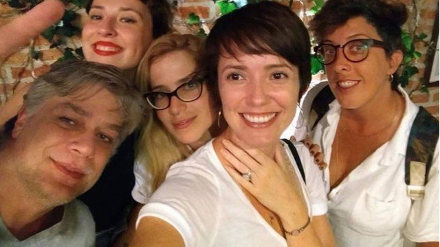 O ator está em cartaz com a peça “Dogville”, em São Paulo, e posou sorridente com a equipe num bar, logo após o espetáculo.