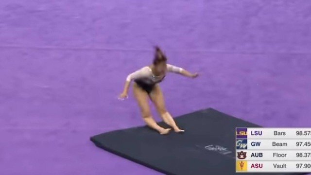 A atleta Samantha Cerio sofreu uma séria lesão durante a disputa do Campeonato Universitário de Ginástica Artística dos Estados Unidos (NCAA), em Baton Rouge.