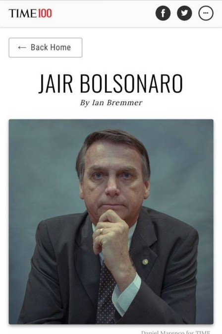 Aos olhos do editor Ian Bremmer, presidente da consultoria de risco político Eurasia Group, Bolsonaro foi descrito como “um personagem complexo”, representando “uma ruptura brusca com uma década de corrupção de alto nível”, ao mesmo tempo em que “é um garoto-propaganda da masculinidade tóxica, um homofóbico ultraconservador”.