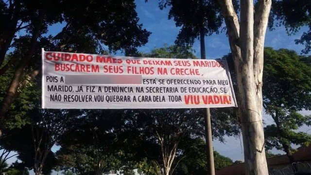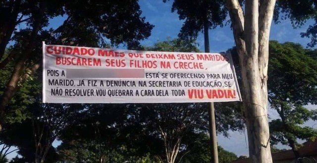 A faixa trazia o seguinte texto: “Cuidado mães que deixam seus maridos buscarem seus filhos na creche, pois (uma funcionária) está se oferecendo para meu marido, já fiz a denúncia na secretaria de educação, se não resolver vou quebrar a cara dela toda. Viu, vadia?”.