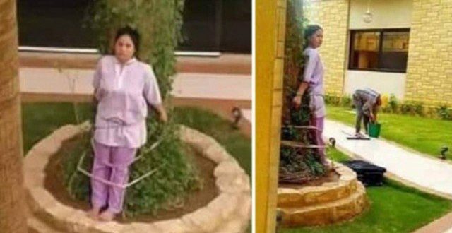 Uma empregada filipina foi amarrada a uma árvore no quintal de uma casa em Riad (Arábia Saudita) como punição aplicada pelos patrões sauditas.