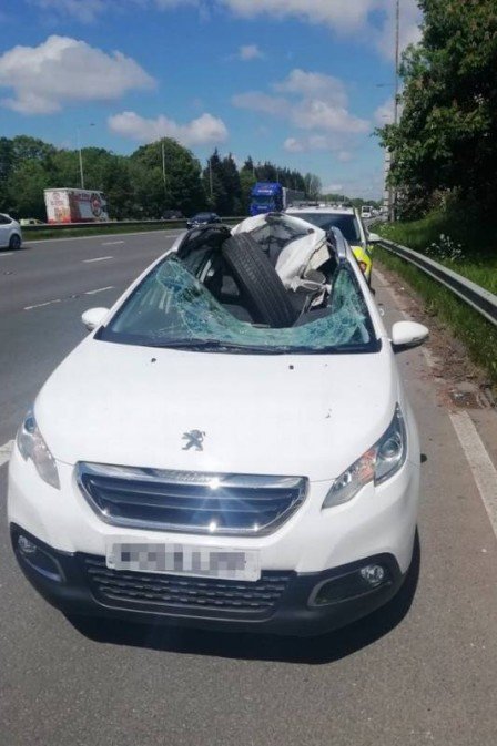 O pneu rasgou o teto e ficou cravado no carro, um Peugeot, e não atingiu o motorista por centímetros. Uma cadeira de bebê no banco traseiro foi atingida pelo pneu. Por sorte (mais sorte), ela não estava ocupada.