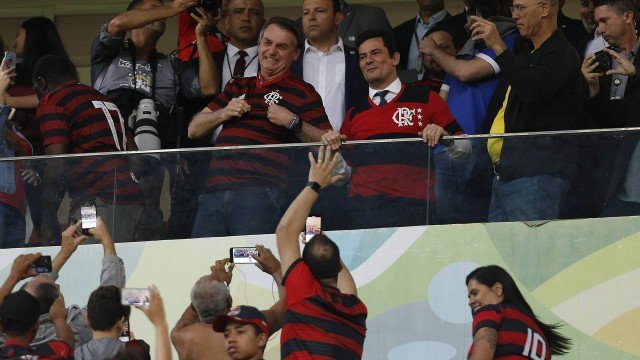 O presidente Jair Bolsonaro e o ministro da Justiça Sérigio Moro posaram com a camisa do Flamengo na arquibancada do estádio Mané Garrincha, em Brasília, antes da partida contra o CSA, pelo Campeonato Brasileiro. Além deles, o ministro da Economia Paulo Guedes também esteve presente.