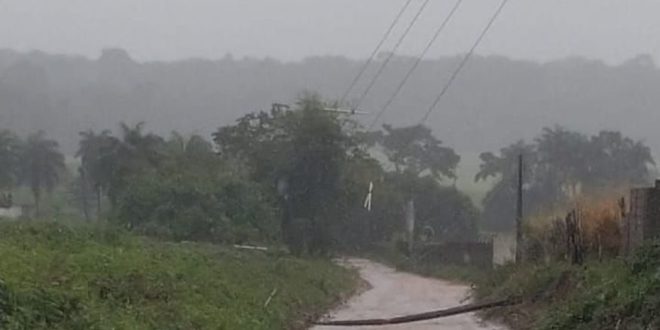 Os postes estão caídos na rua, sentido usina São João, com a fiação próxima ao solo.