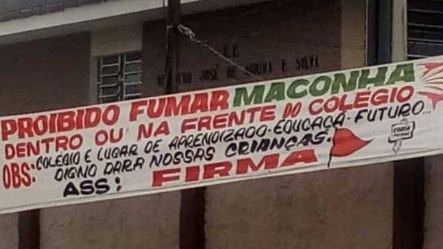 “Proibido fumar maconha dentro ou na frente do colégio. Obs: Colégio é lugar de aprendizado, educação, futuro… Ass: Firma”, dizia o cartaz, já removido do local.