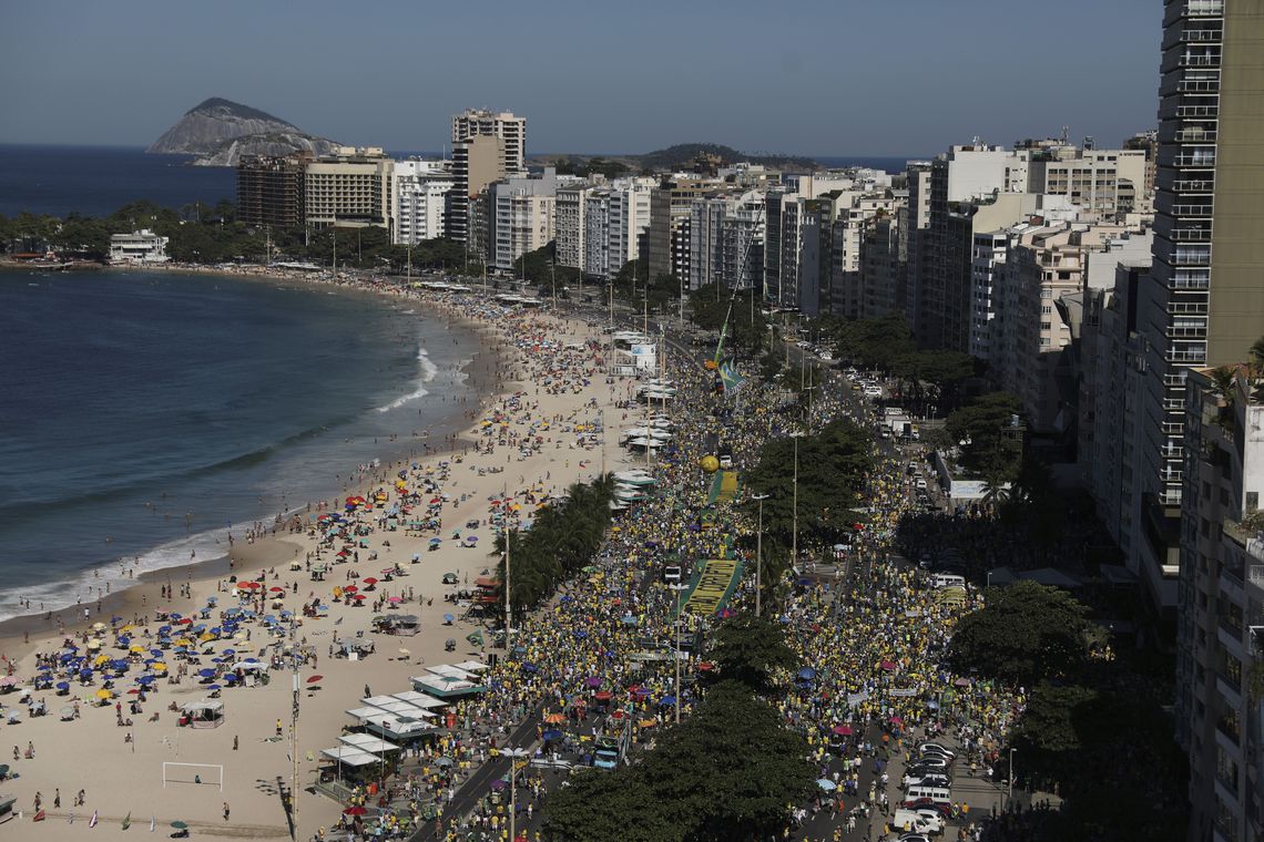 A manifestação pró-ministro Sergio Moro e em apoio às medidas econômicas do governo federal, convocada por vários movimentos da sociedade civil, levou milhares de pessoas à praia de Copacabana, zona sul da capital fluminense. Bandeiras gigantes nas cores verde e amarelo cobriram várias ruas de Copacabana a partir das 10h.