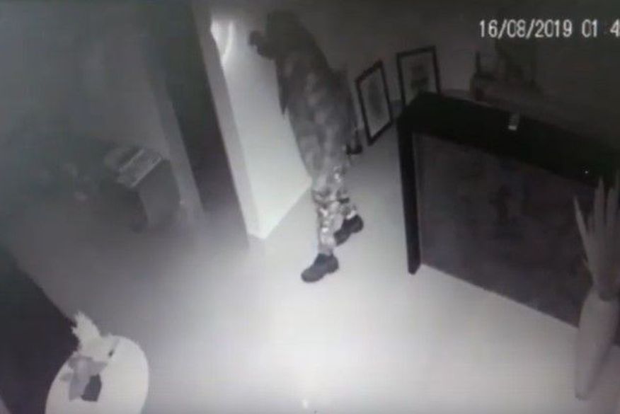 No registro, um homem magro, alto e encapuzado aparece pulando um muro com uma mochila e depois andando com uma lanterna pela recepção.