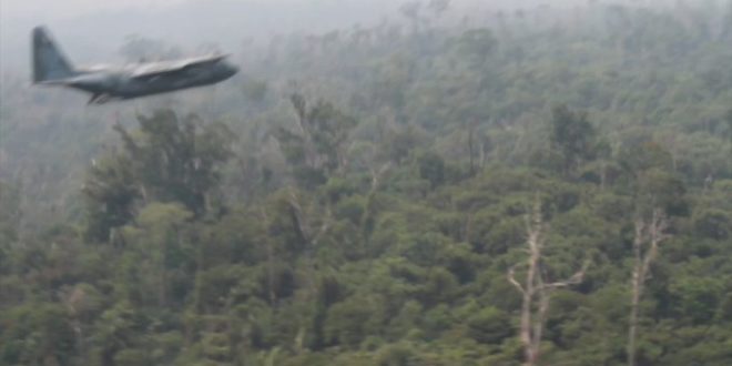 A FAB publicou em sua conta no Twitter imagens de aviões C-130 Hércules, como equipamento composto por cinco tanques de água e dois tubos, com capacidade de carregar até 12 mil litros de água.