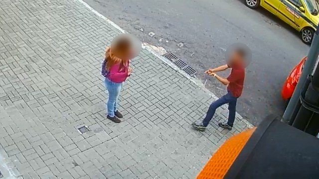 Câmeras de segurança na Rua Tenente França captaram o momento em que um homem sai de um carro vermelho anunciando assalto enquanto “finge” estar armado com os dedos. De imediato, a jovem que estava na calçada levanta os braços, em posição defensiva, mas não chega a entregar a mochila.