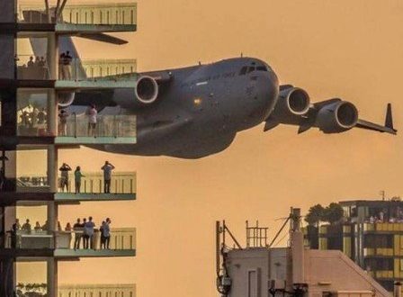Na verdade, eram dois aviões – um cargueiro C-17A Globemaster e um caça F/A-18F Super Hornet – da Real Força Aérea do país passando perto dos prédios.