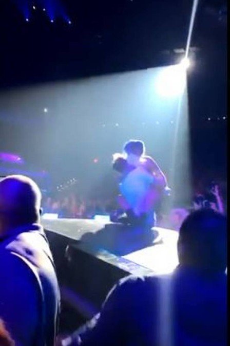 Fãs que estavam no show da turnê “Enigma” gravaram o momento em que a cantora cai do palco com o fã, que parece não ter se dado conta do quão perto estava da borda. O público que estava no local, entretanto, afirmou que a artista continuou a apresentação normalmente após a queda.