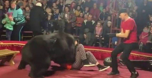 Um urso atacou o seu adestrador durante apresentação em circo na república da Carélia (Rússia), na frente de crianças, que ficaram aterrorizadas com a violenta cena.