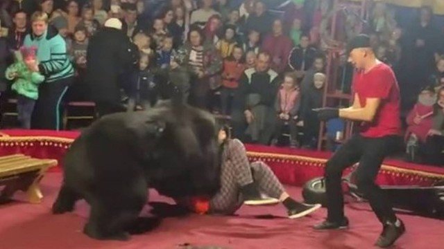 Um urso atacou o seu adestrador durante apresentação em circo na república da Carélia (Rússia), na frente de crianças, que ficaram aterrorizadas com a violenta cena.