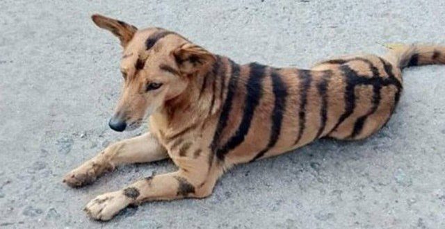 Um agricultor do vilarejo de Naluru (Índia) apelou à criatividade para afugentar macacos da sua plantação: ele pintou o seu cão com listras pretas para que ele ficasse parecido com um tigre de Bengala.