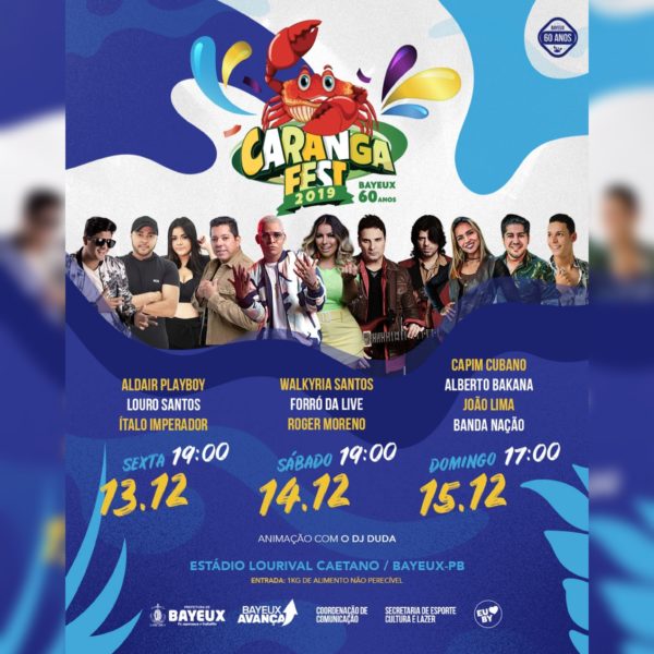 Os 60 anos de emancipação política do município de Bayeux serão comemorados em grande estilo. É que o prefeito Berg Lima reativou a tradicional Festa do Caranguejo, o Caranga Fest 2019, e a cidade vai comemorar seu aniversário ao som de atrações renomadas nacionalmente.