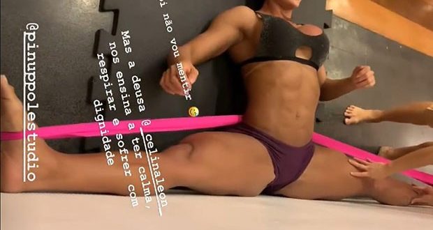 Além da musculação, ela se dedica ao pole dance, ao twerk e a dança; “Dói, não vou mentir”, disse ela sobre o alongamento. Durante a sessão, ela ainda mostrou total domínio no bumbum ao mover os glúteos separadamente (veja vídeo).