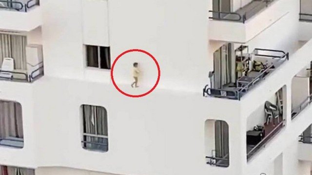 A tensão foi em dose dupla. Ao chegar à varanda, a criança decidiu fazer o caminho de volta, até a janela. A cena de tirar o fôlego foi registrada de um outro prédio.