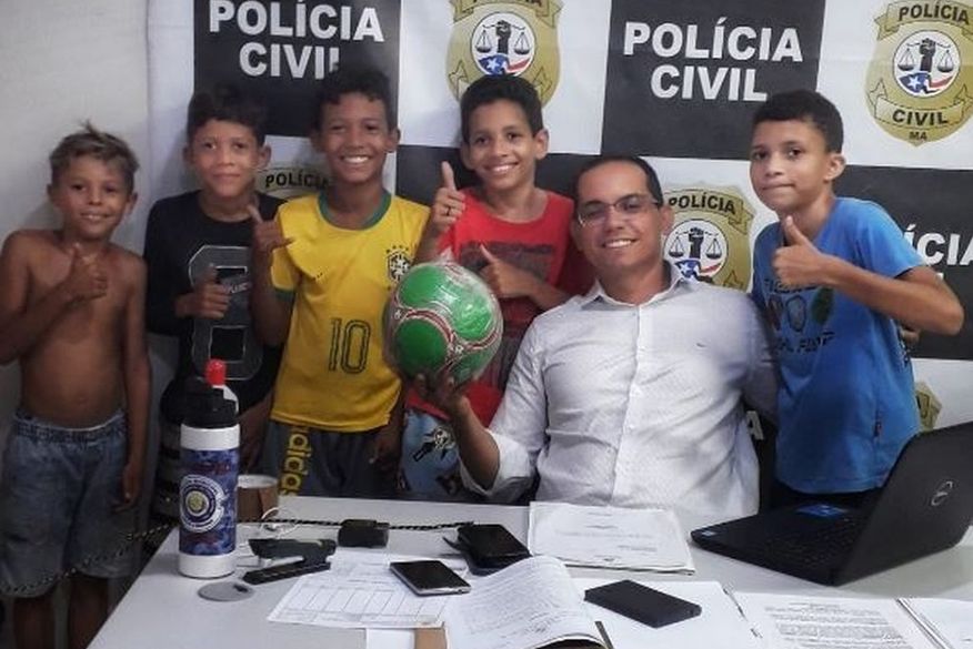 Delegado e a equipe dele deram de presente aos meninos uma nova bola.