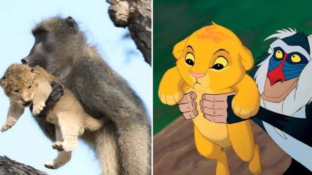 Um macaco reproduziu uma cena de “Rei Leão” no Parque Nacional Kruger, na África do Sul. O babuíno foi visto segurando e cuidando de um filhote de leão como, no desenho animado da Disney, Rafiki fez com o pequeno Simba.
