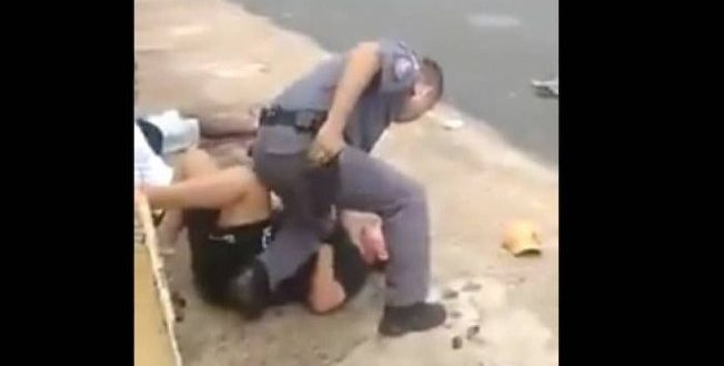 Nas imagens, é possível ver o policial rendendo a mulher, que está deitada no chão. Ele pressiona a barriga dela com um dos joelhos e a agride com tapas no rosto.