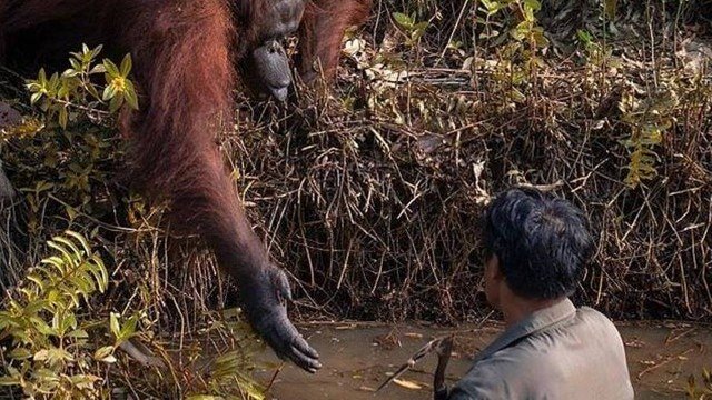 Um orangotango foi visto estendendo uma das mãos a um homem que o animal “pensava estar em perigo” por se encontrar em um rio frequentado por cobras.