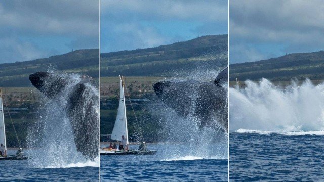Uma baleia-jubarte saltou e quase caiu sobre um catamarã com turistas que navegava pela praia de Kaanapali (Havaí, EUA), conforme flagra feito pelo aposentado Don McLeish.