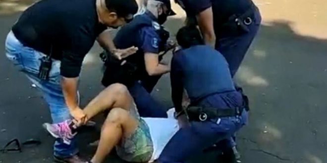 Um vídeo que circula nas redes sociais mostra a mulher em um parque, sentada aparentemente após uma caminhada, quando foi abordada por policiais.