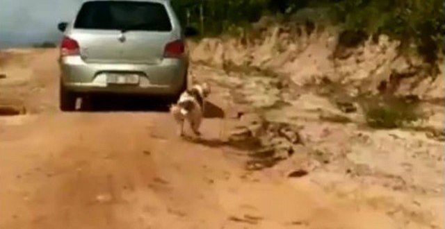 As imagens do animal sendo arrastado pela via foram feitas por um motociclista que passava pelo local e publicou o vídeo nas redes sociais. O cão estava preso com uma corda amarrada no pescoço.