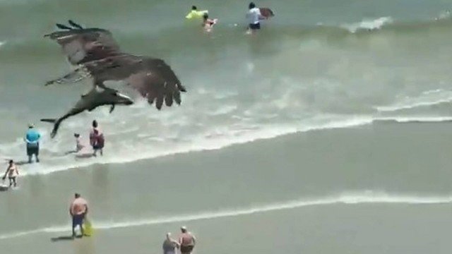 Um vídeo postado no Twitter está deixando muita gente boquiaberta. Nas imagens, registradas em Myrtle Beach (Carolina do Sul, EUA), um pássaro de grande porte é visto voando com o que parece ser tubarão, que teria sido tirado por ele do mar.
