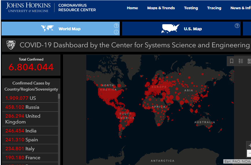 Os dados da Universidade John Hopkins são um pouco diferentes dos divulgados pelo Ministério da Saúde. Segundo o último levantamento do ministério, divulgado neste sábado, o Brasil tem 1.577.004 casos confirmados, 876.359 recuperados e 64.265 óbitos.
