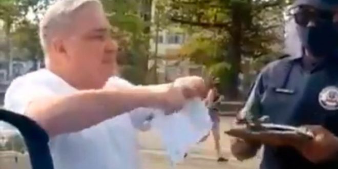 “Você quer que eu jogue na sua cara? Faz aí, que eu amasso e jogo na sua cara”, diz o desembargador ao ser abordado sem máscara, se referindo à multa por não usar o acessório.