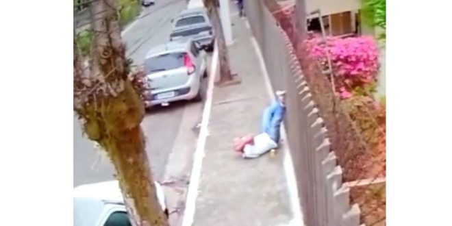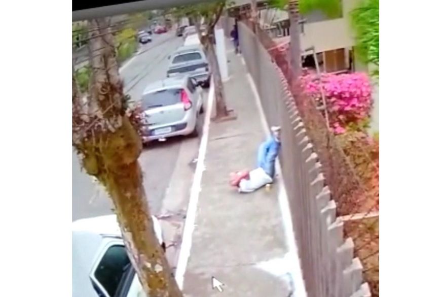 O homem caiu, bateu a cabeça no chão e ficou com as pernas apoiadas no muro. A câmera registra o momento em que ele põe a mão na cabeça e depois o braço dele cai de lado.