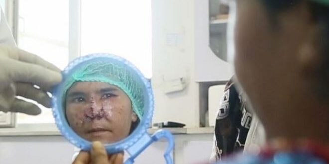 “Estou feliz por ter meu nariz de volta”, disse ela aos médicos, enquanto eles trocavam o curativo.