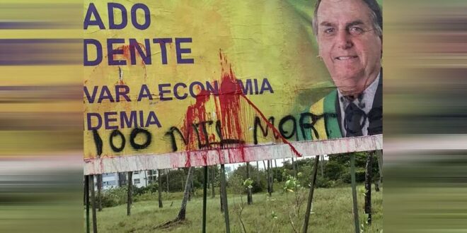 Manifestantes da esquerda jogaram tinta vermelha em um outdoor, atacando com tinta da cor de sangue, e escreveram em preto as palavras ”100 mil mortos”.