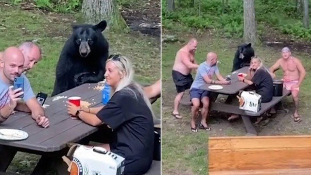 Um urso-negro apareceu e, sem cerimônia, sentou-se à mesa. As pessoas sentadas – quatro homens e uma mulher – não manifestaram medo e se mantiveram tranquilas.