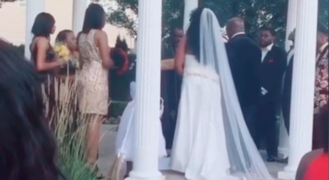 Ainda fora de cena, continua: “e eu (tenho) seu bebê aqui. Anthony, eu sei que você me ouve”. Os noivos continuam fingindo que nada está acontecendo, até que uma das damas de honra, que era filha da noiva, interveem: “É melhor você sair do casamento da minha mãe, o que há de errado com você?”