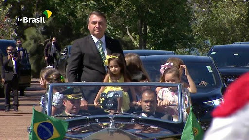 Bolsonaro embarcou no Rolls-Royce da Presidência às 9h55. Percorreu o trajeto até a área externa do Alvorada com a capota aberta e cercado por crianças.